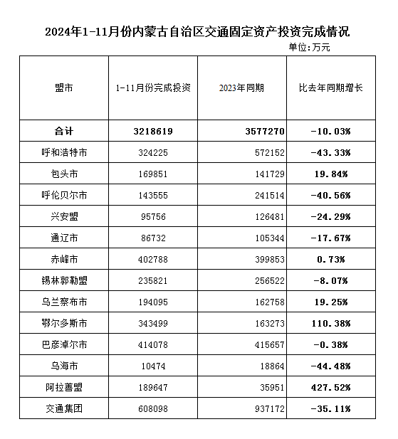 2024年1-11月份全区公路水路交通固定资产投资完成情况(分单位)