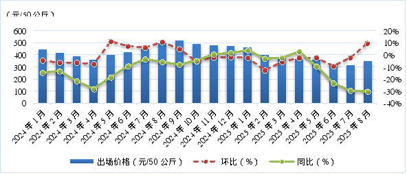 8月份,全区生猪平均出场价格为725.00元/50公斤,与7月份相比(以下简称环比)下降3.27%,与2024年8月份相比(以下简称同比)下降29.02%。从监测周期来看,8月6日、13日、20日、27日全区每50公斤生猪平均出场价格分别为734.33元、723.67元、720.83元、721.17元,前三周降幅逐步收窄,第四周有所回升。8月前三周,受前期压栏大猪集中出栏以及高温天气抑制猪肉消费等影响,生猪出场价格小幅下降;之后,随着天气转凉,猪肉终端消费开始回升,出场价格由降转升。