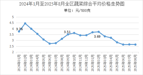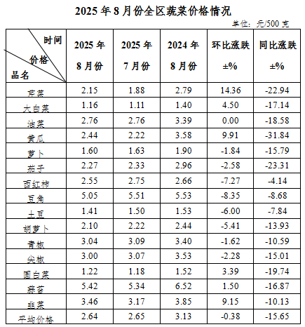 8月份,我区蔬菜价格下降。全区蔬菜综合平均零售价格为2.64元/500克,环比略降0.38%。监测的15种蔬菜品种价格6涨8降1持平,下降幅度居前的品种为豆角、西红柿、土豆、胡萝卜、茄子,分别下降8.35%、7.27%、6.00%、5.41%、2.58%。同比,15个蔬菜品种综合平均零售价格下降15.65%。