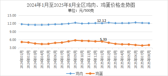 8月份,我区鸡蛋价格上涨。其中鸡蛋价格8月份各旬环比涨幅分别为3.10%、-0.25%、2.51%。白条鸡、鸡蛋8月全区平均零售价格分别为每500克12.13元、4.01元。环比,鸡蛋价格上涨4.97%,白条鸡价格略降0.74%。同比,白条鸡价格上涨1.42%,鸡蛋价格下降25.33%。
