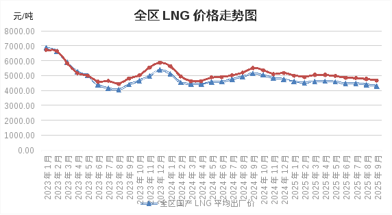 9月份,全区国产LNG平均出厂价格、LNG平均零售价格分别为每吨4281.50元、4653.82元。环比价格分别下降2.01%2.37%,同比价格分别下降16.47%15.31%