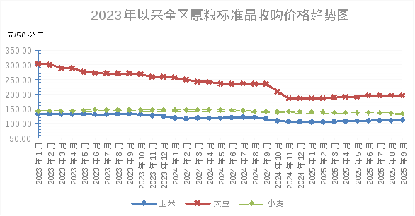 20259月份,全区小麦收购价格略降,玉米收购价格略涨,大豆收购价格稳定;与去年同期相比,小麦、玉米、大豆收购价格均延续下降趋势。