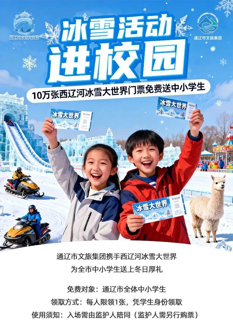 西辽河冰雪大世界火热进行中!通辽市“西辽河冰雪大世界”活动将于2026年1月5日通辽市辽河公园内盛大开园,并持续至2026年2月下旬,为让全市中小学生尽情体验冰雪乐趣,特面向在校中小学生免费发放10万张门票,先到先得!