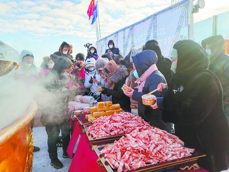 市民游客品尝雪地大火锅