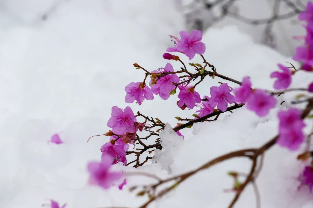 5月,残雪未消,上万朵杜鹃同时绽放,粉紫花潮与蓝冰碰撞,美如梦幻。冰雪未消,花海灿烂,尽显独特魅力。
