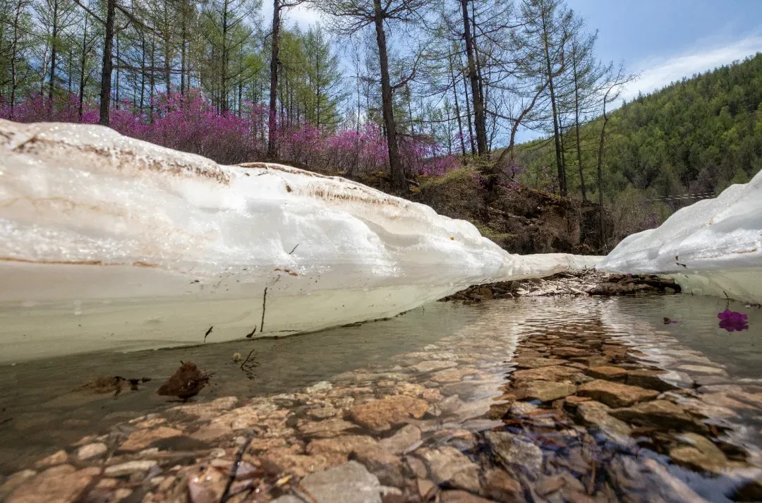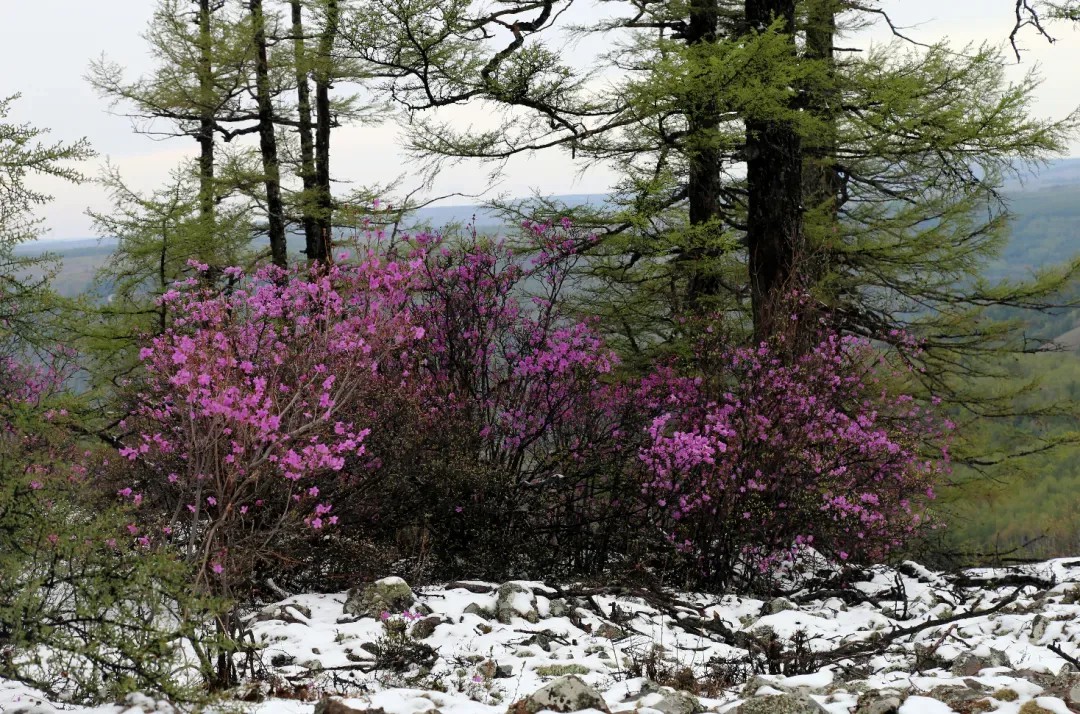 兴安杜鹃扎根万年前的火山熔岩,在零下 40℃的寒冬孕育,5月顶着冰雪盛放。