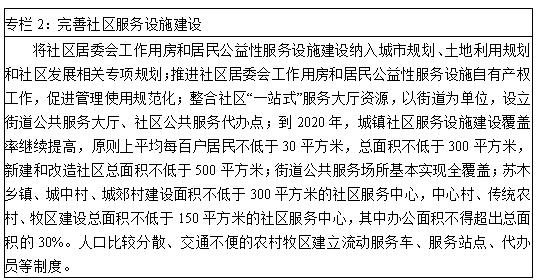 ——加强城乡社区基础服务设施建设。推进城乡社区综合服务设施建设,按照每百户不低于30平方米,总面积不低于300平方米,新建和改造社区总面积不低于500平方米的标准进行建设;在有条件的地区,开发社区户外活动场所,推进社区居住环境的绿化、美化、亮化。到2020年,城镇社区服务设施建设覆盖率继续提高;街道公共服务场所基本实现全覆盖;苏木乡镇、城中村、城郊村建设面积不低于300平方米的社区服务中心,中心村、传统农村、牧区建设总面积不低于150平方米的社区服务中心,其中办公面积不得超出总面积的30%。