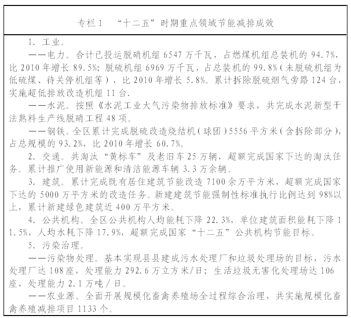 “十二五”时期,自治区党委政府高度重视节能减排工作,认真贯彻落实党中央、国务院节能减排决策部署,坚持节约优先、保护优先、自然恢复为主的方针,以强有力的措施推进节能减排,顺利完成了“十二五”节能减排目标任务,有力地推进了经济转型升级提质,为实现自治区可持续发展奠定了良好基础。