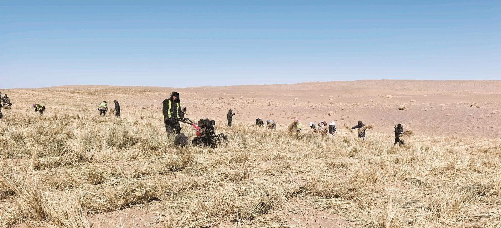 “我们3月4日正式复工。年前已经把稻草、机械和人员全部准备到位,开春第一时间投入建设,确保不误工期。”项目负责人王泽林站在沙丘上,指着眼前成片的草方格介绍,“该项目于2025年9月启动实施,总投资15325万元,治理任务为8.2282万亩,其中工程固沙4.9326万亩、灌木造林加工程固沙3.2956万亩,可带动就业500余人。按照计划,项目将于今年5月底完工。”