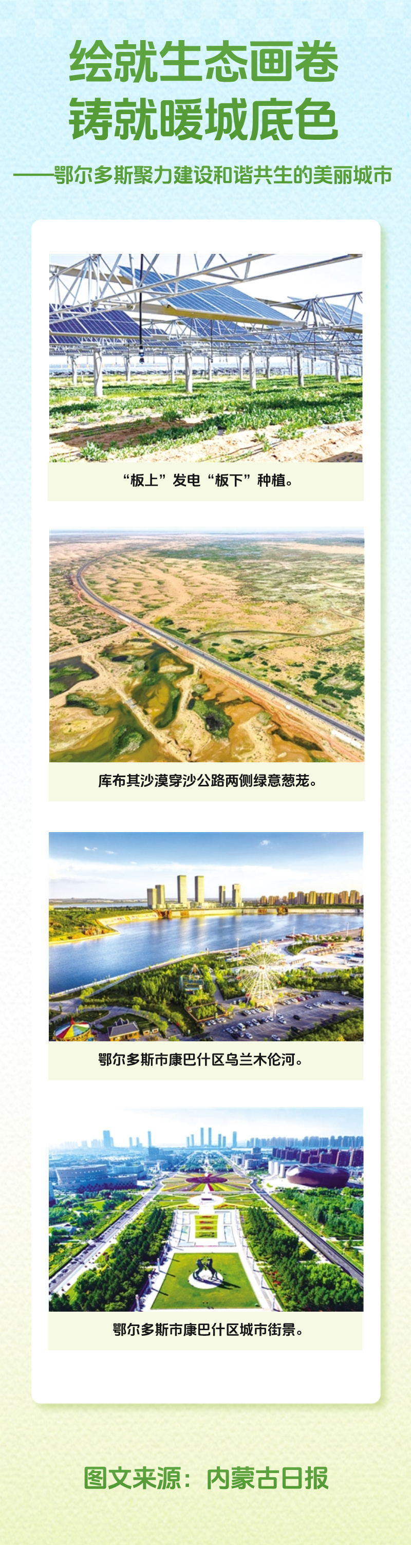 生态是底色,更是底气。聚力建设和谐共生的美丽暖城,如今的鄂尔多斯市,沙漠变绿洲、矿山披绿装、碧水绕城乡,绿色发展理念深入人心,生态治理成效有目共睹。