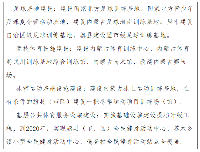 (一)强化足球基础设施建设。将公共足球场地等基础设施建设纳入本地区国民经济和社会发展规划,把兴建足球场纳入城镇化和新农村、新牧区建设总体规划。编制《内蒙古足球运动基础设施建设规划(2015-2020年)》。在呼和浩特和包头市分别建成国家(北方)足球训练基地和国家(北方)青少年足球夏令营活动基地。通过新建或改造,实现每个盟市拥有1个自治区级足球训练基地和1个自治区级青省年足球夏令营活动基地,每个旗县(市区)拥有1个盟市级足球活动场地。
