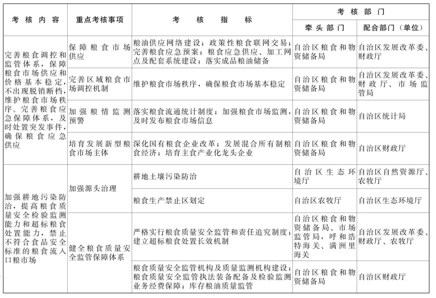 第六条 粮食安全盟市长责任制考核内容包括增强粮食可持续生产能力、保护种粮积极性、增强地方粮食储备能力、保障粮食市场供应、确保粮食质量安全、落实保障措施等6个方面,由各牵头部门具体落实(详见附件)。
