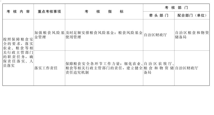 第九条 粮食安全盟市长责任制考核各牵头部门、单位会同配合部门、单位,结合年度重点工作任务,细化考核指标,制定考核方案,经考核工作组审定后印发。考核内容和重点考核事项调整需经考核工作组批准,考核指标可根据国家、自治区年度重点工作安排部署作出相应调整。