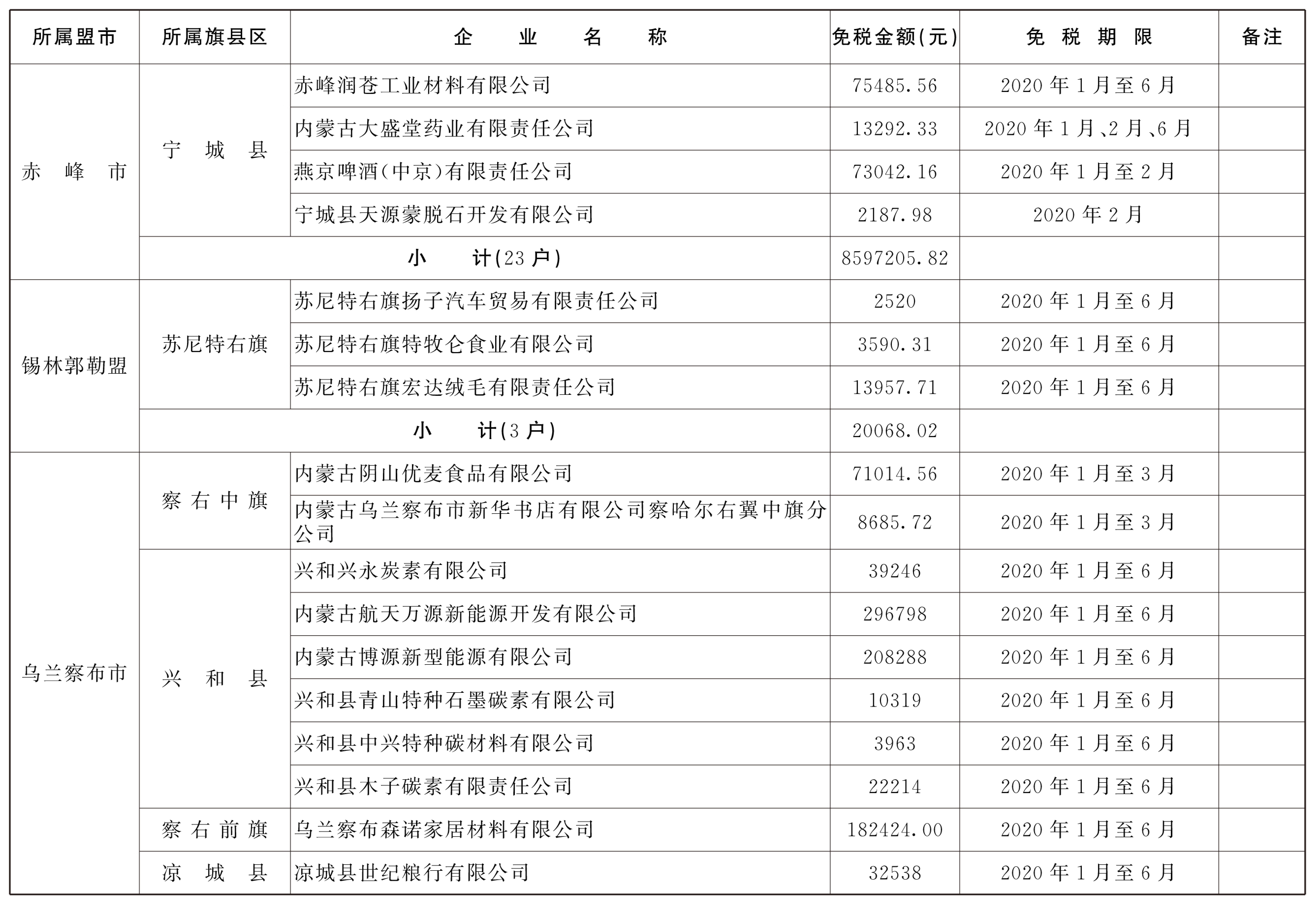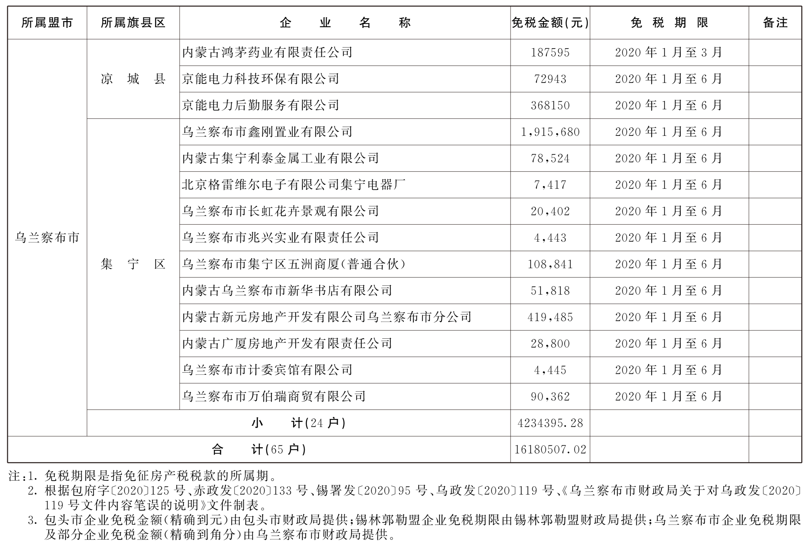 一、同意免征包头市、赤峰市、锡林郭勒盟、乌兰察布市65户受新冠肺炎疫情影响企业应纳房产税合计16180507.02元。其中,包头市15户,免税3328837.9元;赤峰市23户,免税8597205.82元;锡林郭勒盟3户,免税20068.02元;乌兰察布市24户,免税4234395.28元。具体免税企业名称、免税金额和免税期限见附件。