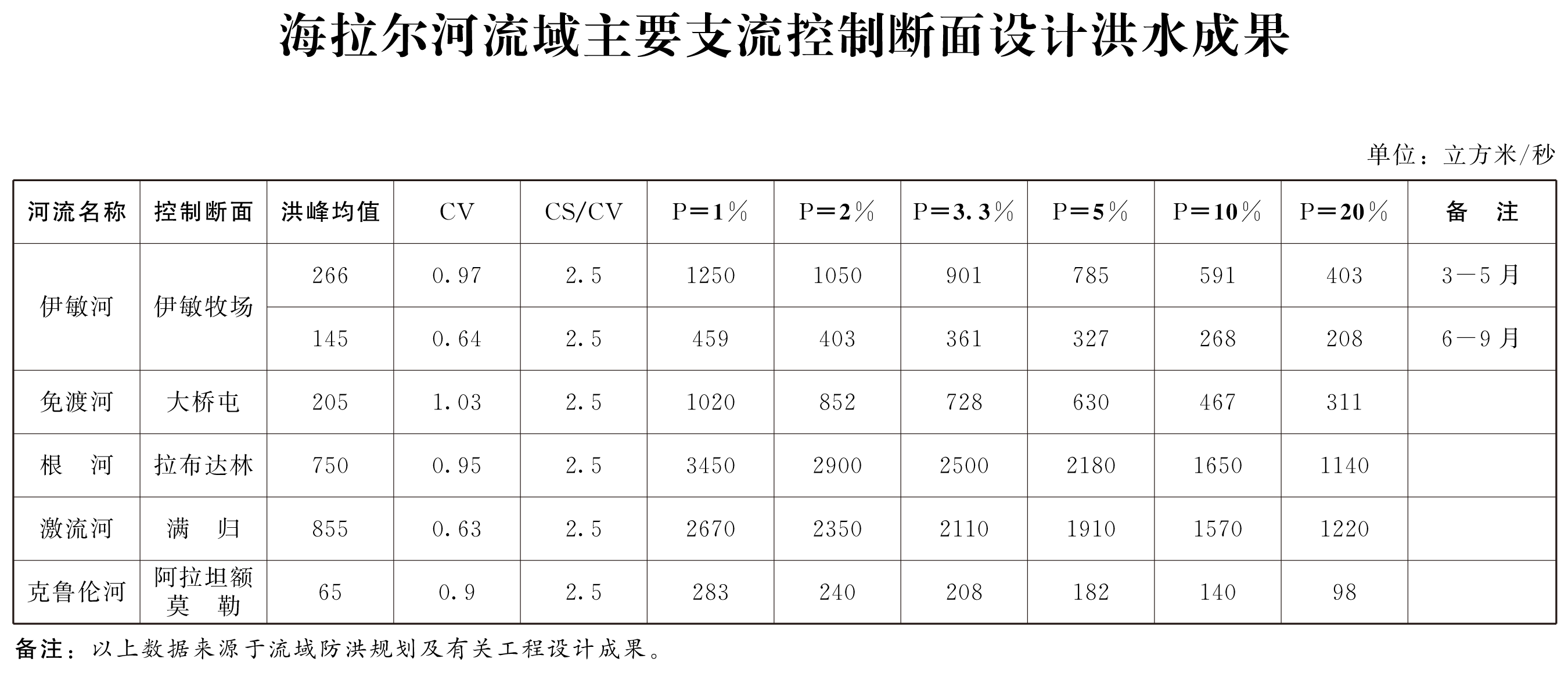 2.黄河流域、辽河流域、嫩江流域、海拉尔河流域主要支流控制断面设计洪水成果
