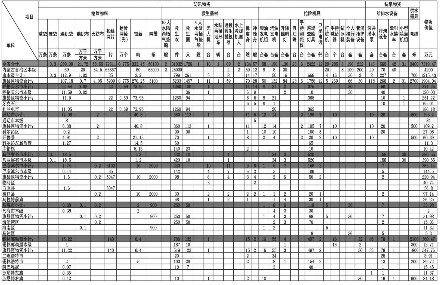 3.自治区级防汛抗旱物资储备情况表