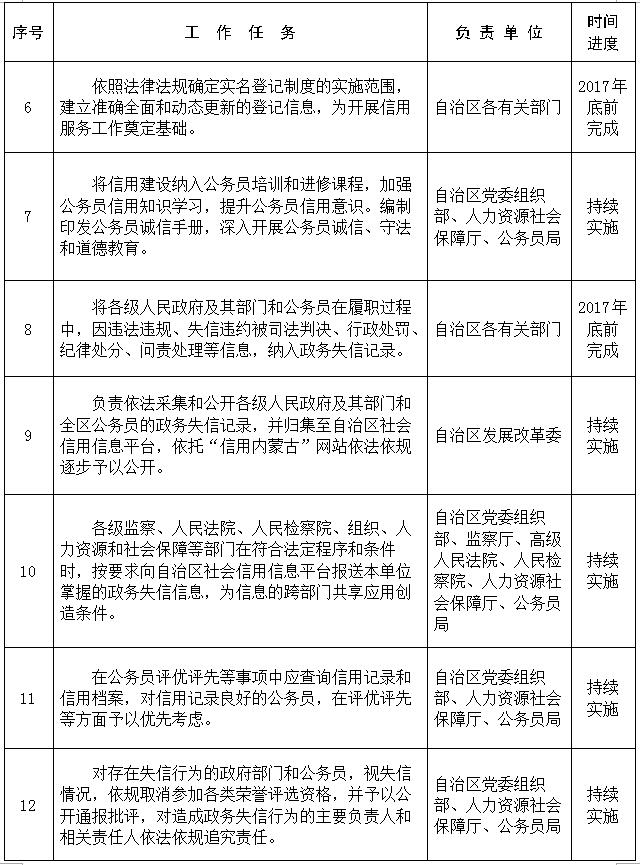 3.建立政务失信记录的归集机制。自治区发展改革委负责依法采集和公开各级人民政府及其部门和全区公务员的政务失信记录,并归集至自治区社会信用信息平台,依托“信用内蒙古”网站依法依规逐步予以公开。