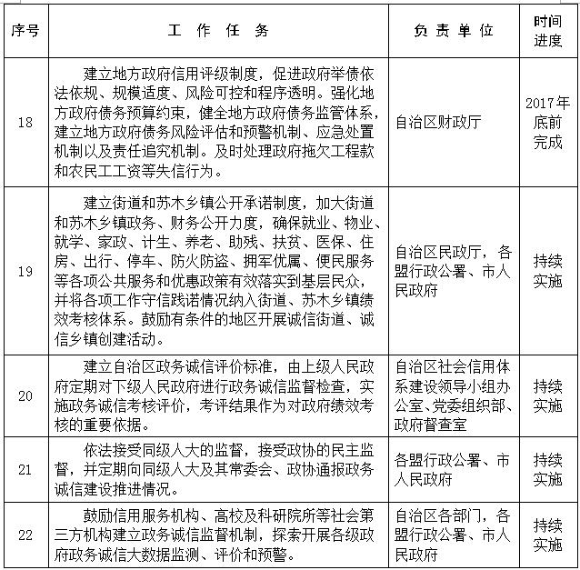 (三)建立考核机制。自治区社会信用体系建设领导小组办公室会同自治区党委组织部、人力资源社会保障厅、政府督查室等相关部门,对各地区、各部门政务诚信建设工作开展情况进行考核督查,并将考核结果纳入区直部门和盟行政公署、市人民政府绩效考核范围。