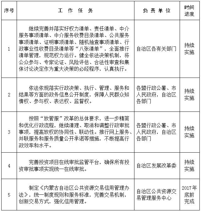 5.进一步规范公共资源交易活动。制定《内蒙古自治区公共资源交易信用管理办法》,统一制度规则和服务标准,完善交易机制,创新交易方式,强化信用管理。