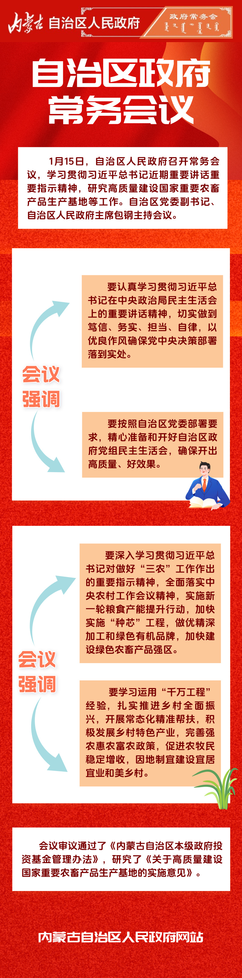 1月15日,自治区人民政府召开常务会议,学习贯彻习近平总书记近期重要讲话重要指示精神,研究高质量建设国家重要农畜产品生产基地等工作。自治区党委副书记、自治区人民政府主席包钢主持会议。
