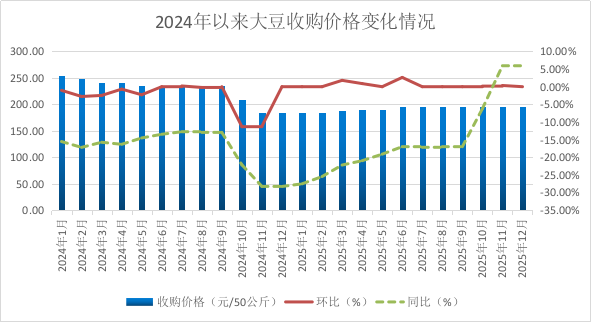 2025年,我国粮食再获丰收,分作物看,玉米、豆类单产均有所增加,小麦单产持平,全年全国粮食产量稳定在1.4万亿斤以上,为全年粮价基本稳定奠定了基础。2026年在播种面积和作物品种结构动态调整的基础上,整体粮食产能和抗风险能力将继续提升,综合ld体育中国官方网站、供需等影响因素,预计2026年粮食价格以稳中窄幅波动为主。一、2025年全区粮食价格走势分析小麦 从近年来我区小麦收购价格走势情况看,2020年-2023年小麦标准品平均收购价格呈稳步上行趋势,2024年-2025年小麦标准品平均收购价格小幅回落,与玉米价格正相关。2025年全区小麦标准品平均收购价格为134.79元/50公斤,较2024年价格下降5.64%。    从月度价格走势看,1-2月份小麦价格稳中有升,春节前夕用粮企业采购力度加大,交易市场活跃,小麦收购价格小幅上涨。3-11月,为腾仓换库,各级储备粮库加大陈麦轮出力度,市场供应宽松。后续随着主产区新麦集中上市,农户集中售粮叠加陈麦轮出,市场流通粮源充裕。制粉企业因面粉需求稳定,原粮采购以刚需补库为主,饲料企业受玉米价格震荡调整影响,小麦替代性价比减弱,采购节奏放缓,麦市供需宽松格局进一步放大,小麦价格逐月小幅下降。12月,部分地区受物流影响及基层余粮偏少,一定程度缓解供应压力,小麦价格略有回升。截至12月末全区小麦每50公斤平均收购价格为130.54元,比年初价格下降5.68%。玉米 从近五年我区玉米收购价格走势情况看,2021-2023年,受养殖业和玉米深加工行业快速发展,玉米需求快速增长,玉米价格在需求紧平衡下高位运行。2024-2025年,我国玉米由供需紧平衡转为供大于需,叠加进口粮食价格下行,我国玉米收购价格持续承压下行。2025年全区玉米标准品平均收购价格为108.16元/50公斤,较2024年价格下降6.41%。  从月度价格走势看,1月,由于前期玉米购销量价齐跌,且北方地区气温较低便于农户储粮,售粮主体手中持粮较多,货源供应较为充足,导致玉米收购价格持续下降。2-9月,随着市场购销逐步恢复,基层余粮减少,持粮主体对后市看涨情绪持续升温,出货意愿不强,促使市场供应趋紧。随着气温回升,工业需求迎来季节性回暖;进口方面,据海关总署数据显示,1-9月我国玉米及玉米粉进口量累计同比减少约92.7%,多种因素共同拉动玉米价格稳步上涨。10-12月,农户秋收结束后出货心态转强,贸易商顺价售粮意愿增加,供应压力逐步释放。需求端来看,下游多以按需采购为主,中间贸易商补库积极性不高。叠加养殖行业利润较低或存在亏损情况,养殖需求对玉米价格支撑较弱,导致玉米价格承压下行。截至12月份全区玉米标准品平均收购价格为每50公斤109.72元,比年初价格上涨5.53%。    大豆 2021-2022年,进口大豆到货量减少,全区收购大豆价格出现较大幅度上涨,2023-2025年受进口大豆价格低迷影响,叠加需求增长缓慢,我国大豆价格承压运行。2025年全区大豆平均收购价格为192.14/50公斤,较2024年下降15.86%。      从月度价格走势看,1—12月份全区大豆收购价格整体呈现稳中波动上涨态势。春节前产区农户手中大豆余粮较多,需求相对稳定,节后工厂复工,收购主体增加,市场迎来一波交易活跃期;6月份基层余粮不足,供应量偏紧,大豆价格小幅上涨。第三季度基层粮源基本见底,市场购销放缓,下游豆制品消费需求处于淡季,加工企业以刚需补库为主,国产豆价格总体平稳。第四季度因前期收获季遭遇连续阴雨天气,导致关内大豆降质减产,更多贸易商采购优质东北大豆补库,叠加今年东北豆农惜售情绪较重,共同推动大豆价格震荡上行。截至12月份呼伦贝尔市大豆每50公斤平均收购价格为196.00元,比年初价格上涨5.95%。        二、2026年粮价走势预测近日,中央农村工作会议提出锚定农业农村现代化,加力实施新一轮千亿粮食产能提升行动。2026年,在播种面积和作物品种结构动态调整的基础上,叠加各项ld体育中国官方网站精准灵活调控,共同促进粮食价格保持在合理水平。具体来看:小麦 供应方面,据国家统计局公告显示,2025年小麦总产量2801.4亿斤,同比略减0.5亿斤,总体基本保持稳定。叠加储备粮源库存充足,ld体育中国官方网站端托市小麦常态化拍卖、各级储备粮轮换投放力度加大,粮源补给充足,为市场筑牢价格运行底线,购销双方对ld体育中国官方网站节奏形成稳定预期。需求方面,后期如果玉米价格持续走高将进一步增强小麦饲用替代作用,但食用需求刚性增长,制粉企业面粉消费以刚需为主,增量有限,市场供需结构偏宽松。综合考虑,预计2026年小麦收购价格在ld体育中国官方网站托底下稳中小幅波动。玉米 供应方面,2025年华北地区收获期遭遇持续阴雨,导致部分地区玉米质量下降,国内玉米供应面临整体增产与优质粮源减少的结构性矛盾。2024/2025年度进口量降至较低水平,在ld体育中国官方网站调控与国内供给保障的双重架构下,预计后续进口继续保持低位。从ld体育中国官方网站层面看,以玉米生产者补贴为核心的连续性ld体育中国官方网站为种植户提供稳定收益预期,后期种植面积预期稳定。需求方面,养殖市场普遍处于产能过剩价格低迷的周期底部,短期内玉米饲用需求增长受限,展望后市,养殖市场或迎来改善,从而抑制饲料需求降幅。深加工方面,行业正处于高产能和低利润的常态化矛盾中,市场对玉米工业消费的预期更趋理性,年度消费