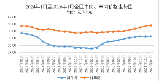 牛肉、去骨羊肉1月全区平均零售价格分别为每500克33.91元、38.36元。环比,牛肉、去骨羊肉价格分别略涨0.47%、0.63%。同比,牛肉、去骨羊肉价格分别上涨17.62%、8.18%。