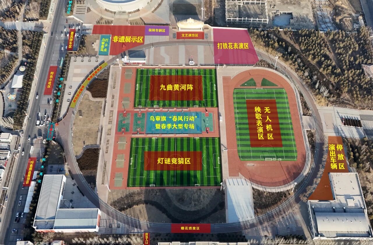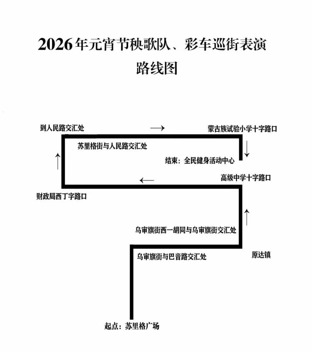 2026年乌审旗元宵节系列文化活动来啦届时将有超多精彩活动轮番上演九曲黄河阵 乌审走马 非遗展演千人秧歌 焰火秀 无人机表演……更有一系列好看 好玩 好热闹的元宵盛宴等你来!活动安排如下灯笼展时间:2月27日(正月十一)至3月4日(正月十六)地点:全民健身活动中心2026年乌审旗“青马踏春·灯火润心”元宵文艺晚会时间:3月1日(正月十三)5:30地点:萨拉乌苏剧院九曲黄河阵时间:3月1日至4日(正月十三至正月十六)地点:全民健身活动中心千人秧歌表演时间:3月2日(正月十四)15:00地点:全民健身活动中心乌审走马巡街表演活动一:“马上游乌审”时间:2026年3月2日(正月十四)8:30地点:乌审旗嘎鲁图镇区活动二:乌审走马走进全国秧歌展演时间:2026年3月3日(正月十五)地点:陕西省榆林市高跷、打铁花、梅花桩舞狮等非遗展演时间:3月2日至3日(正月十四至正月十五)地点:详细请看下方区域布置图限定:打铁花仅3月3日(正月十五)上演!机甲、机器人表演时间:3月2日至3日(正月十四至正月十五)地点:全民健身活动中心灯谜竞猜时间:3月2日至3日(正月十四至正月十五)地点:全民健身活动中心“走马迎春牧歌起,非遗味浓闹元宵”主题活动时间:3月2日至3日(正月十四至正月十五)地点:全民健身活动中心乌兰牧骑、文化独贵龙展演时间:3月2日至3日(正月十四至正月十五)地点:全民健身活动中心秧歌大赛时间:3月3日(正月十五)8:30地点:全民健身活动中心焰火、无人机表演时间:3月3日(正月十五)8:00地点:全民健身活动中心元宵节主会场分布图2026年元宵节秧歌队、彩车巡街表演路线图灯火满草原欢腾闹元宵带上家人朋友奔赴这场民俗盛会在璀璨光影里共赴美好新征程
